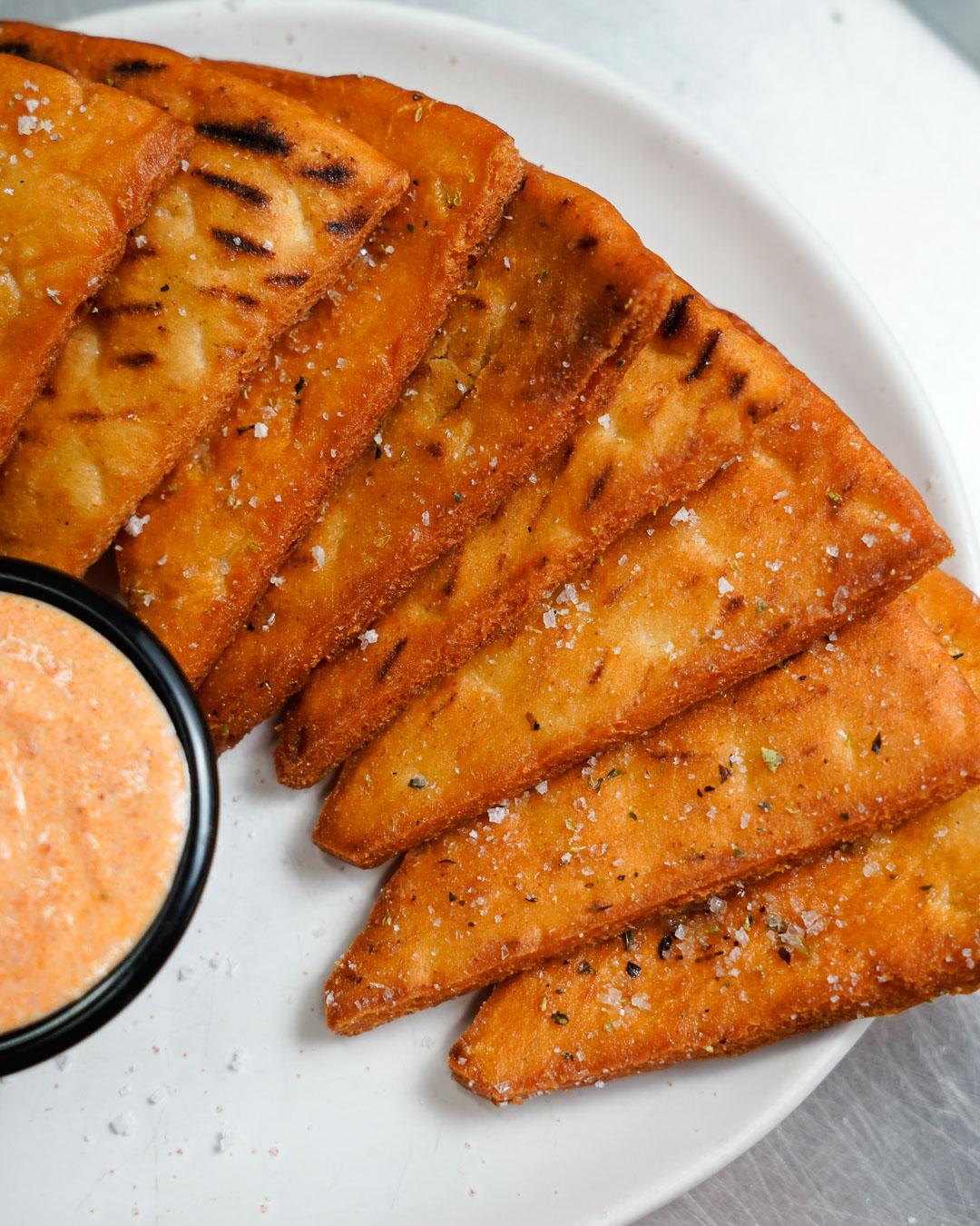 All dips made in-house — tzatziki, spicy feta, eggplant and more — with warm pita bread.